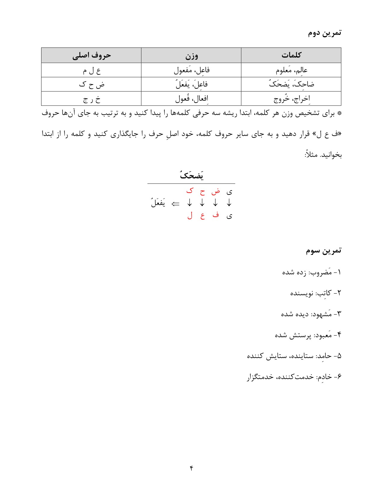 • شناسایی حروف اصلی کلمات (اوزان): این بخش به شما کمک می‌کند تا حروف اصلی (ریشه) کلمات را تشخیص دهید و وزن آن‌ها را بفهمید که اساسی برای صرف افعال و اشتقاق کلمات است.