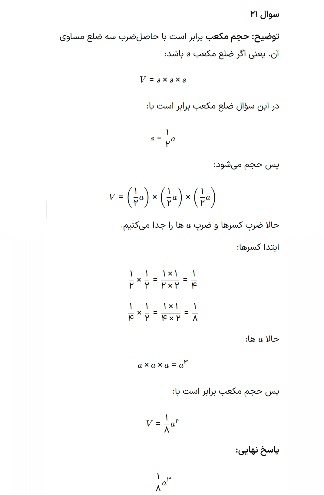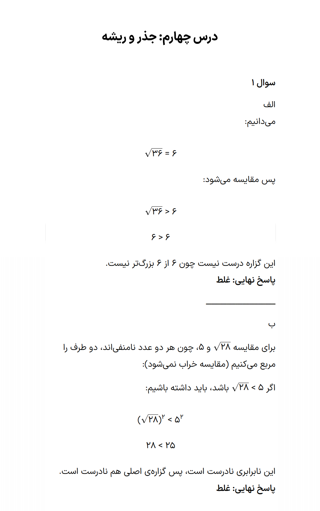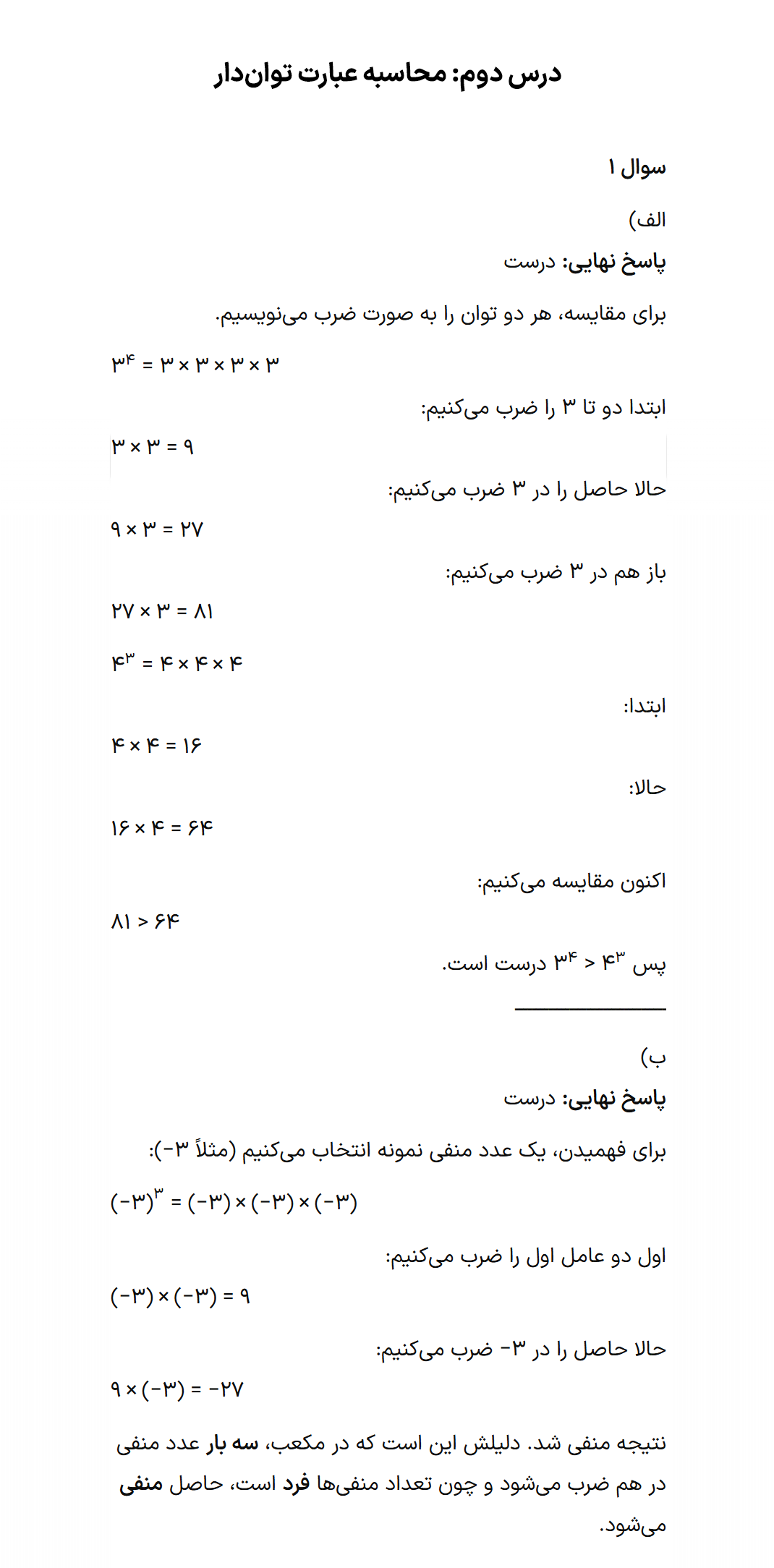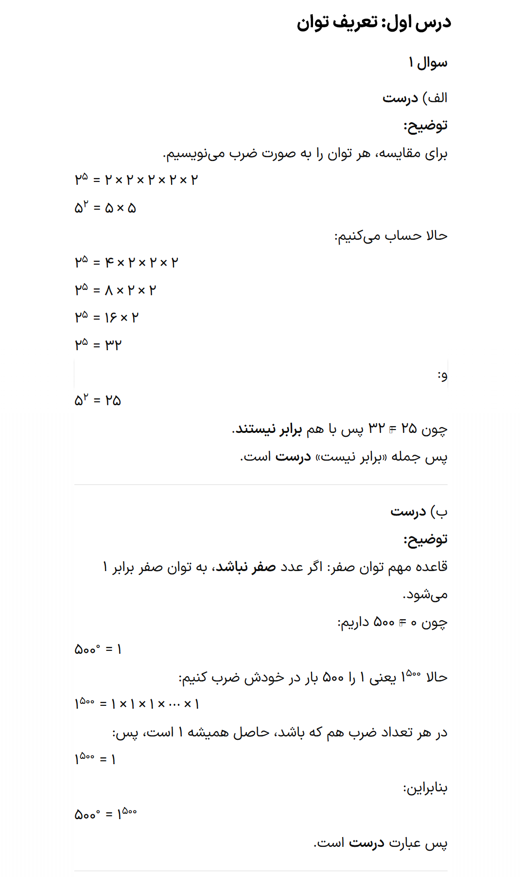 برای این که خیال خود را بابت جامع بودن توضیحات هر سوال و کیفیت آن‌ها راحت کنید، می‌توانید نمونه تصاویری که از همین پاسخنامه در ادامه درج شده است را بررسی کرده و سپس در صورت تمایل، فایل کامل PDF پاسخنامه فصل 7 (با عنوان توان و جذر) را از همین صفحه از سایت خریداری بفرمایید.
