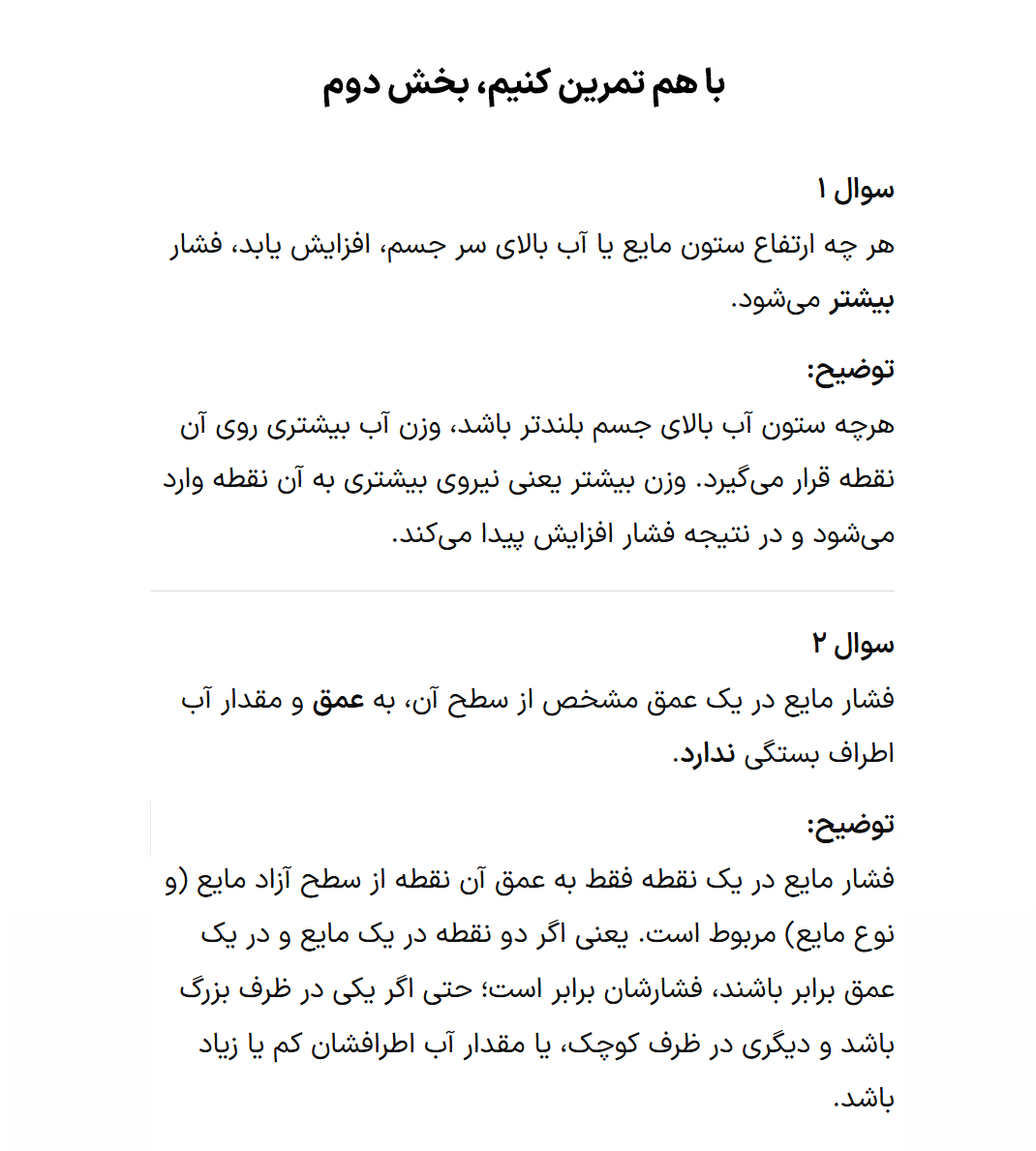 با توجه به محاسباتی بودن این فصل (مبحث فشار و اصل پاسکال)، سعی شد پاسخنامه جامع با توضیحات کافی برای هر سوال آماده بشه. امیدواریم استفاده کافی رو ازش داشته باشید.