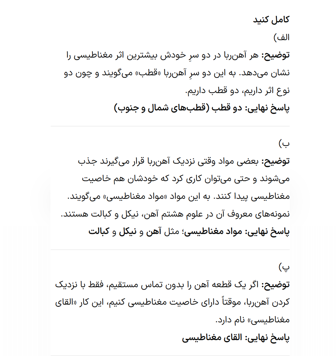 پاسخنامه کتاب کار علوم خیلی سبز هشتم فصل دهم (مغناطیس)